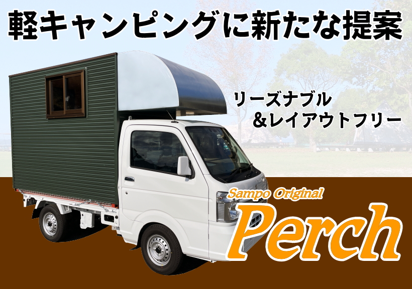 Perchは三宝自動車が提案する新しい軽キャンピングのカタチ。 紀州材のブロックが生み出すレイアウトフリーな室内空間はまさに「注文住宅」。 車両販売のほか、お手持ちの車両に搭載することもできます。